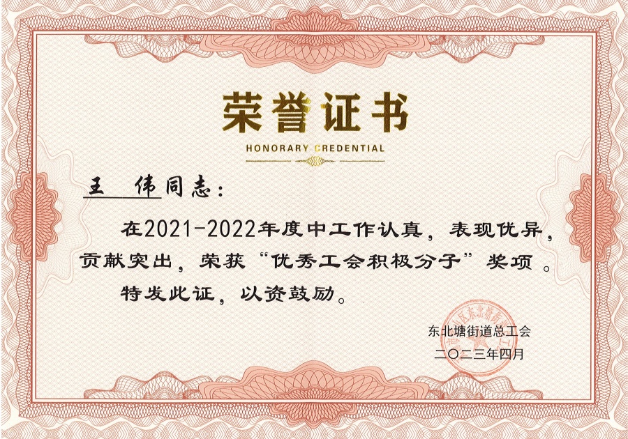王偉同志榮獲“2021-2022年度東北塘街道優(yōu)秀工會(huì)積極分子”稱號(hào)。