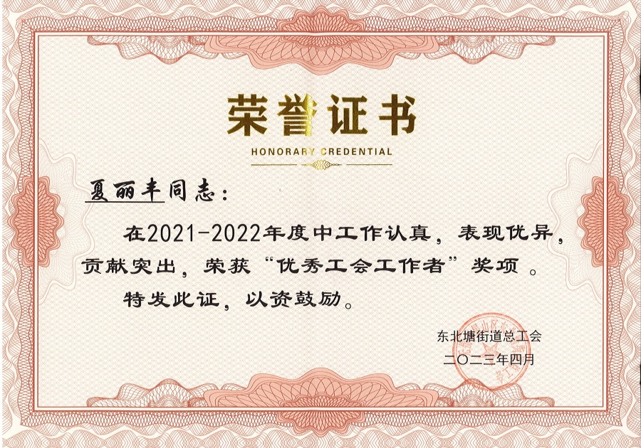 夏麗豐同志榮獲“2021-2022年度東北塘街道優(yōu)秀工會(huì)工作者”稱號(hào)。