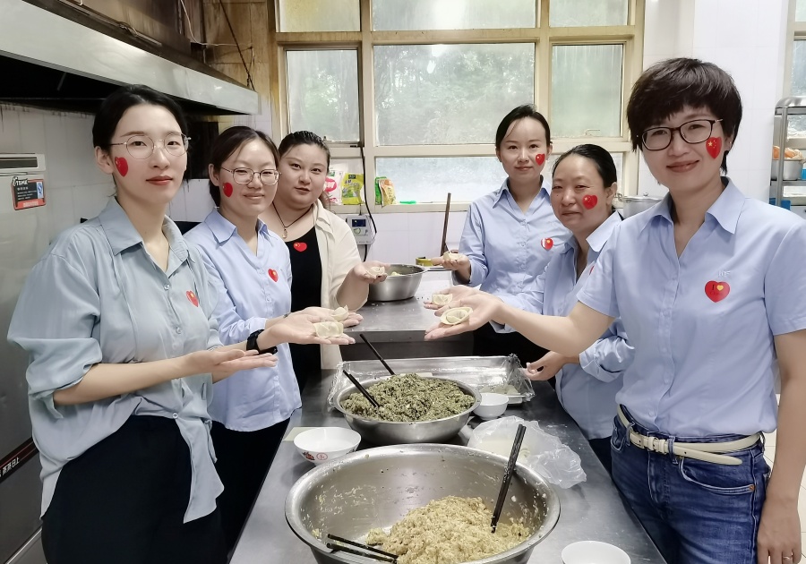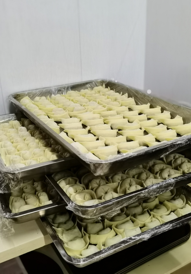 食堂里,師傅們早已準備好了餡料和餛飩皮,就等著包餛飩能手們大展身手。將餛飩皮攤在手心,舀上餡料,一折一捏,一個美觀飽滿的餛飩就包好了。在大家的巧手下,滿滿幾大盆的餡料很快見底,取而代之的是一盤盤美味可口的餛飩。