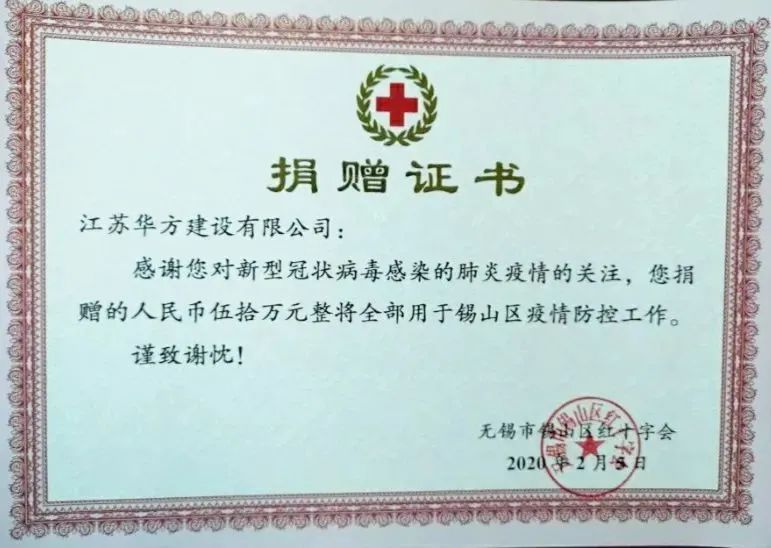 在今年的疫情防控阻擊戰(zhàn)中,華方第一時間就向無錫市錫山區(qū)紅十字會捐贈人民幣50萬元,用于支持全區(qū)疫情防控工作。大年初四晚8點左右,為全力配合完成防疫查控點建設任務,華方調派專人積極配合區(qū)住建局領取防疫物資1000多公斤,安排專人對8個防疫點、24個集裝箱進行鋪設,用整整 9個半小時的堅守圓滿完成任務;2月12日,華方管理人員又向地方交警中隊和派出所送去慰問物資,用實際行動支持那些奮戰(zhàn)在防疫一線的公安干警們。疫情期間,得知紅十字中心血站血庫告急,員工們積極逆行獻血、為愛接力。