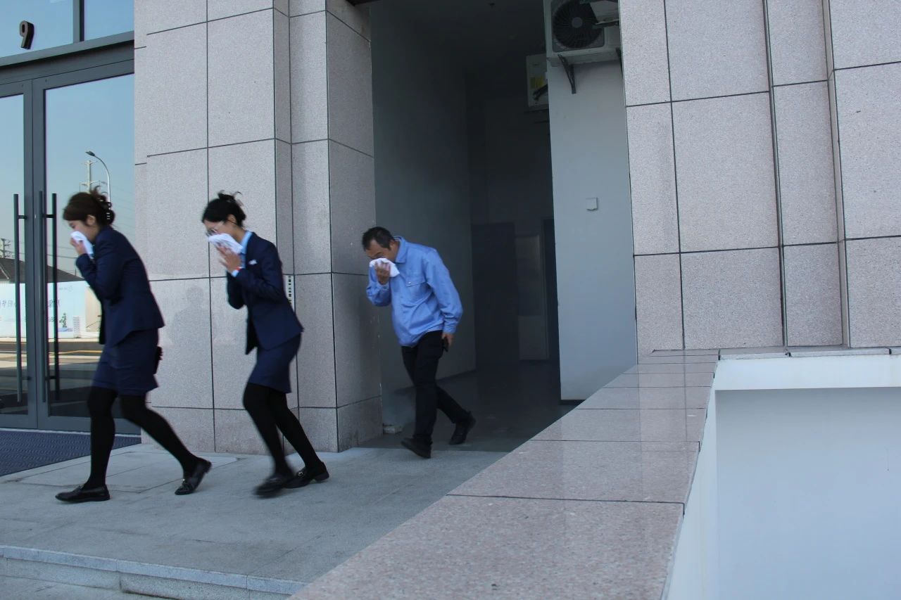 演練模擬了大樓突發火災的情景,全體工作人員在專業人士的指導下,低頭彎腰、捂住口鼻,有序迅速地進行安全疏散。